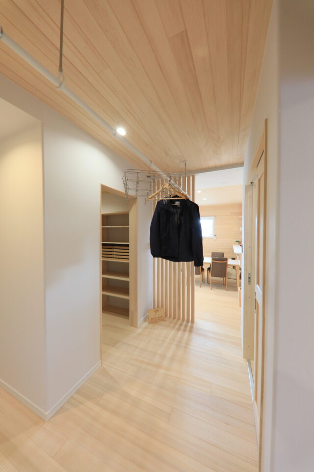 もみの木ハウスの家と、普通の家との大きな違いは「洗濯物が驚くほどよく乾く」ということ。洗濯物が乾きにくい梅雨や冬場でも、もみの木ハウスの家では除湿機やガス乾燥機の出番がありません。夜に洗濯物を干して、朝には乾いた服を着ていけるので、洗濯物の渋滞も起こらない。また、もみの木ならではのお着替えクローゼットを設置することで、洗濯物の整理整頓が楽になり家事を効率よくできます。