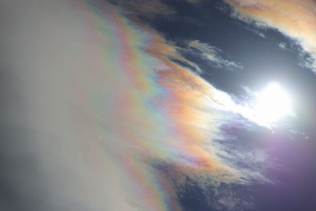 空を見上げると雲が虹色になっています。急いでカメラの準備をしてレンズフィルターを偏光タイプに入れ替えました。ファインダーをのぞくとくっきりな彩雲が見れました。