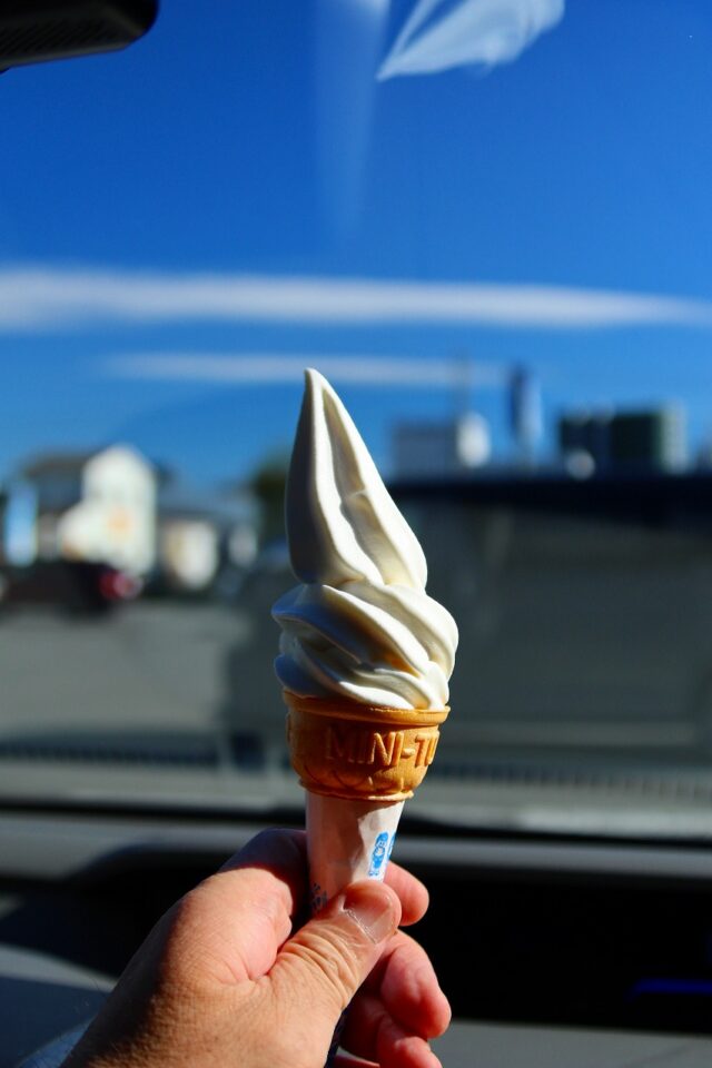防波堤を回ろうとしましたが通行止めでした。色々と問題があるのでしょう。帰る事に。ソフトクリームが食べたいと妻が言うので生協に寄ってソフトクリームを食べます。久々で美味い!