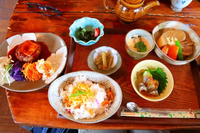 その後は「陶芸の里あすか」でランチを頂きます。岩切さんの仲間という事で特別に開けて頂きました。ありがとうございます。ランチはハンバーグランチです。