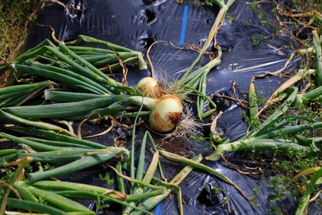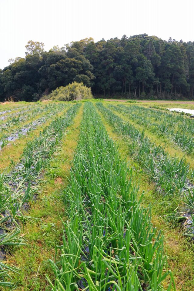 その後は岩切さんの畑に向かいます。今回は玉ねぎ畑でした。収穫途中の畑なんですが、話を聞くと面白い。草と作物を共存させる話は面白かった。雑草を利用するって「畑の草取りに行くよ!!」ってよく行っていましたからね。