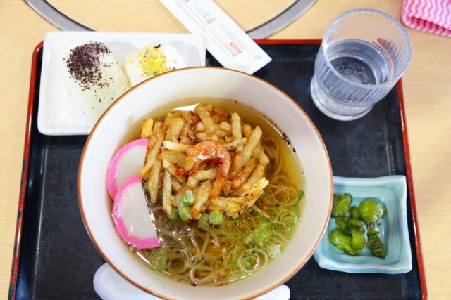 と孫が言い出します。パパと来た時に食べて美味しかったらしいです。で、神話の里のレストランに入ります。孫たちはざる蕎麦、自分はかき揚げ蕎麦を食べます。