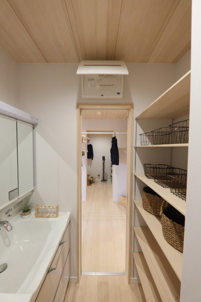1、玄関から洗面脱衣室の出入り口が見える間取り
