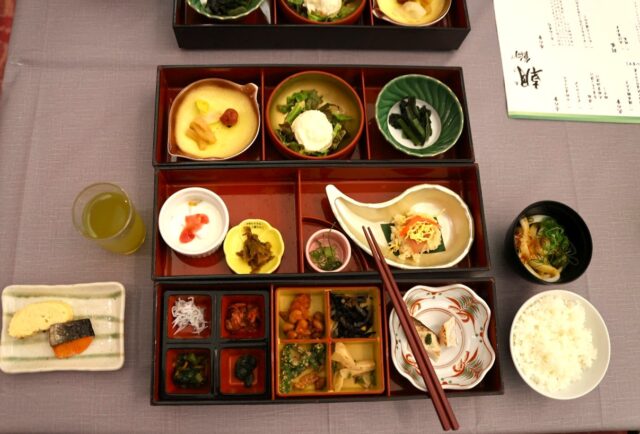 朝ご飯は7時半からです。三段重ねの器に色々な食べ物が入っています。普段はこんな食べ方しませんから別世界にやって来ている感じがしました。美味しくいただきお腹もいっぱいです。