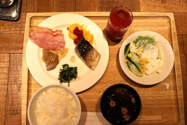 着替えて荷物をまとめてから6時55分に皆で集まり、朝食会場へ向かいます。今日はバイキングでした。食べ過ぎているので軽めにします。