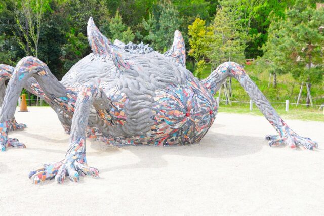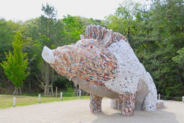 それからもののけの里へ向かいます。櫓がありその下にはたたり神が居ます。タイルを砕いて貼ってあるので局面も再現されています。ガウディの様ですね。
