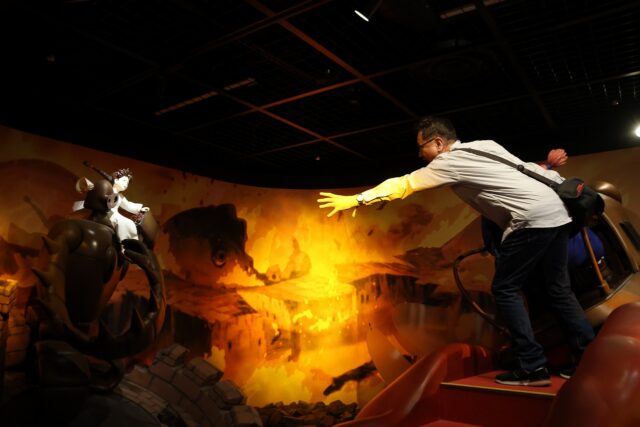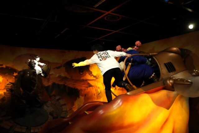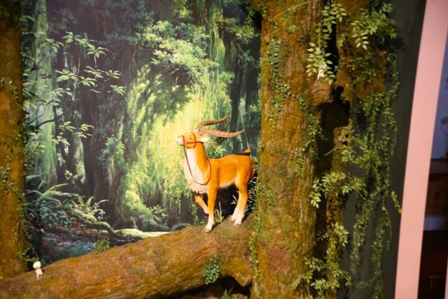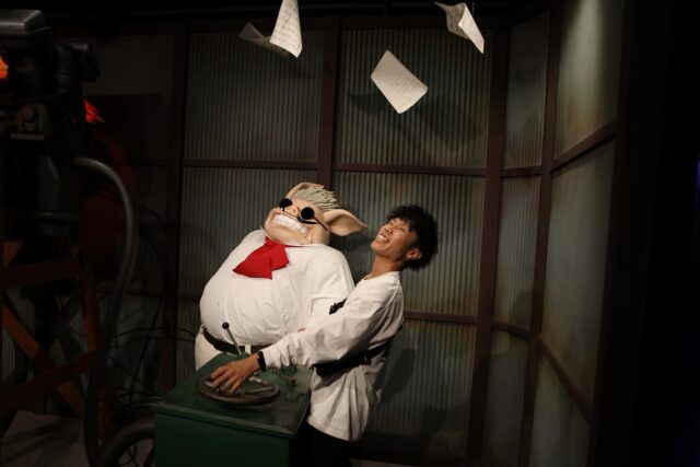 で、時間になったので「ジブリの大倉庫」へ向かいます。約1時間並ぶ事に。中に入ったらアニメを再現して写真撮影が出来るコーナーが色々とありました。そこも並んでいます。