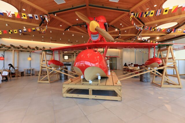 疲れたので「ロタンダ風ケ丘北口カフェテリア」で休憩します。ここには紅の豚の愛機「サボイア」があります。が、スケールがおかしい。でかすぎです。それでも喜んで写真を撮ります。