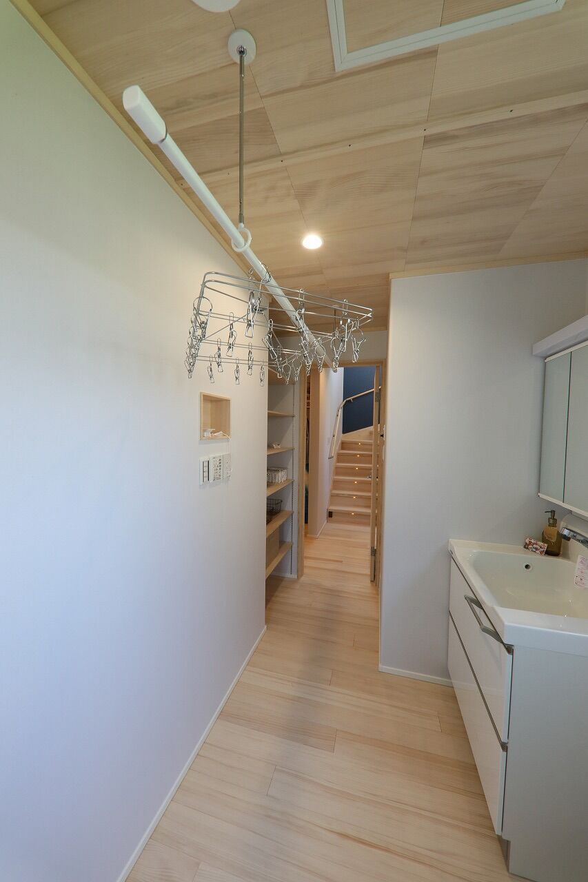 ここは洗面台のある空間に洗濯物干しを設けています。近くにはお着替えクローゼットも設置されています。洗濯の家事は楽です。