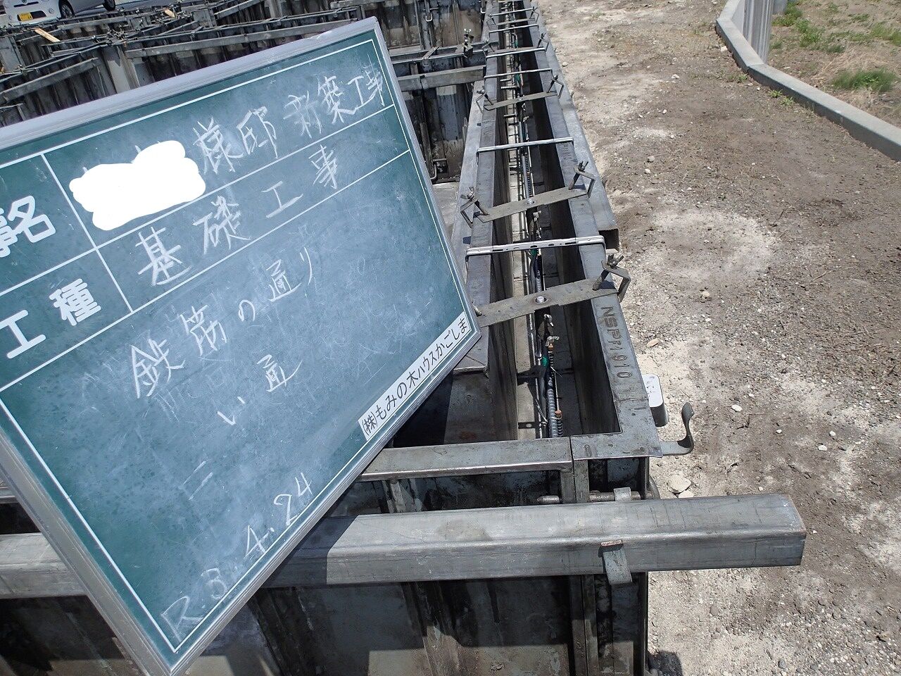 基礎の立ち上がりコンクリートを流し込む前にアンカーボルトやホールダウン金物の設置をミリ単位の正確さでセットしていきます。