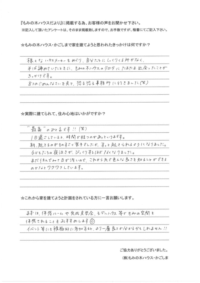 様々なハウスメーカーをめぐり、自分たちにしっくりくる所がなく、半ば諦めていたときにもみの木ハウスのブログにたまたま出会ったことがきっかけです。