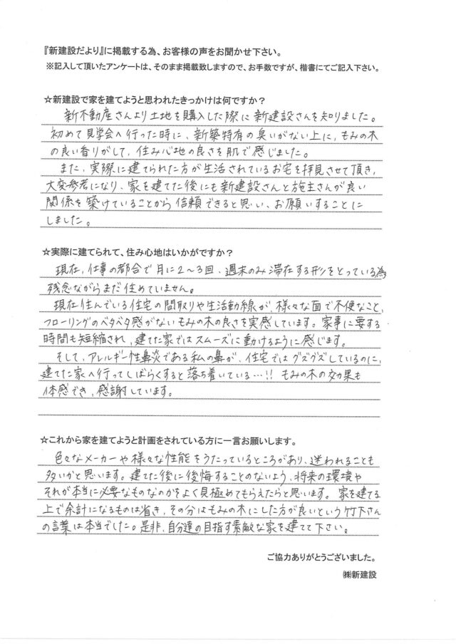 初めての見学会へ行った時に、新築特有の臭いがない上に、もみの木のいい香りがして住み心地の良さを肌で感じました。